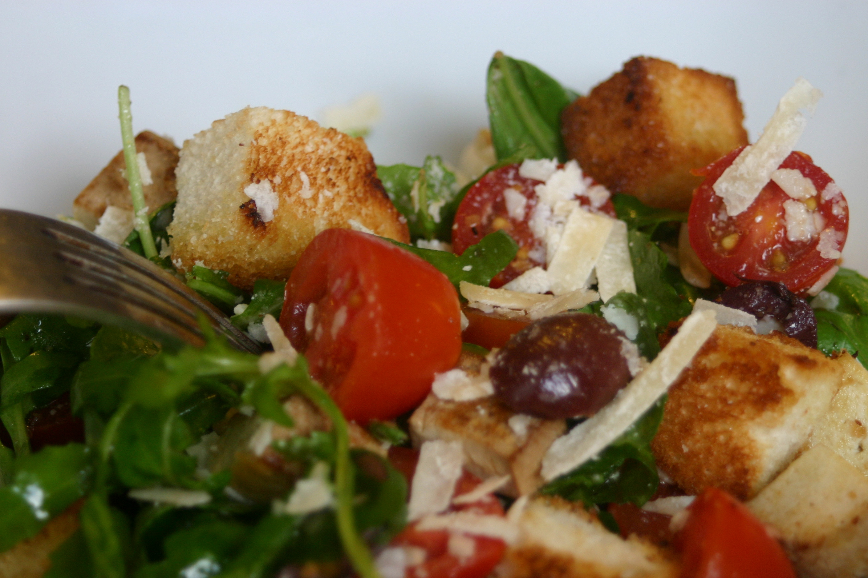 • Räuchertofu, Kirschtomaten, Oliven, Rucola und Basilikumblätter mit der Salatsoße gut mischen. Zum Schluss geriebener Parmesan oder Mandeln zugeben und Croutons unterheben.