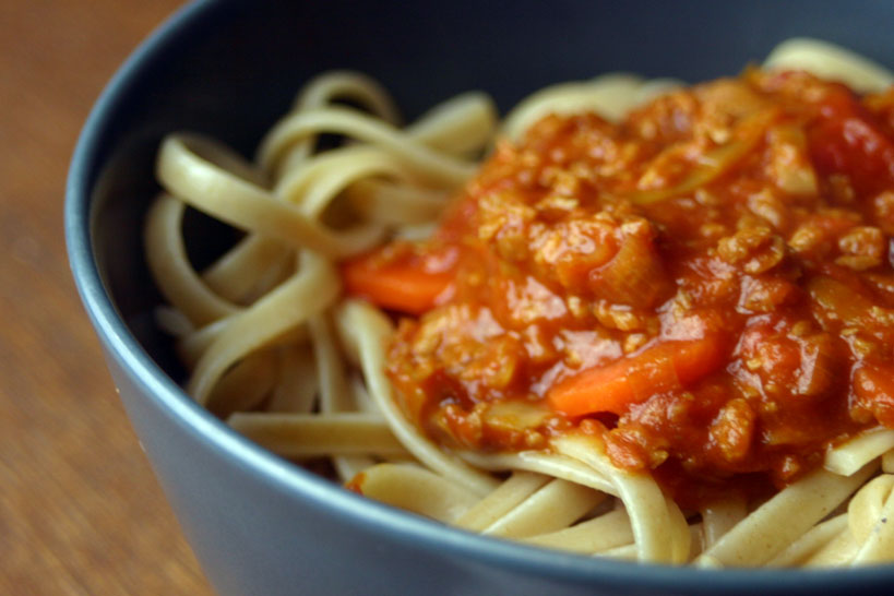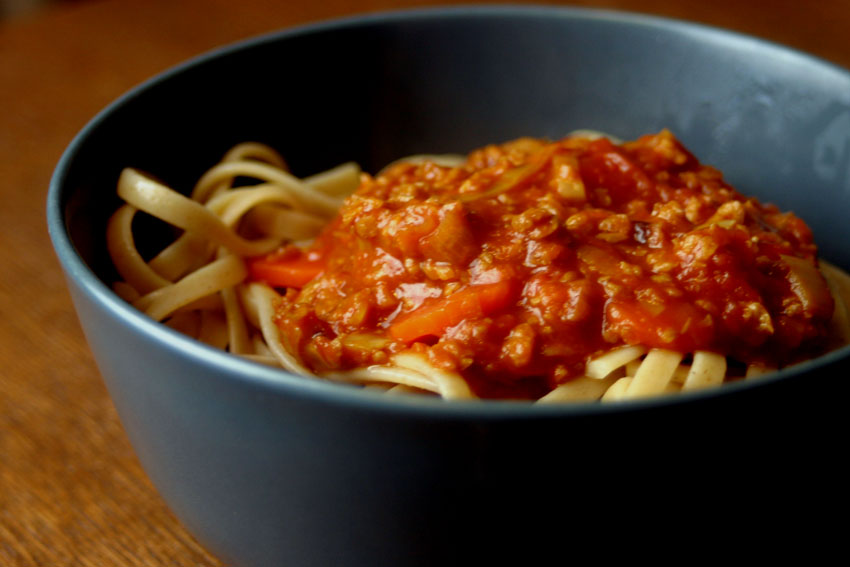 Natürlich machen sich frische Kräuter oder auch ein Schluck Wein immer gut in einer Bolognese. Wir haben bei unserer Kreation jedoch darauf geachtet, dass die Zutaten in der Regel sowieso im Haus sind, so dass der Fastfood-Charakter nicht ganz verloren geht.