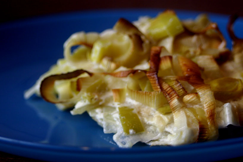 - Lauch halbieren, waschen und in feine Ringe schneiden. Auf die Kartoffeln geben und großzügig mit der Sojasahnemischung übergießen, so dass der Lauch größtenteils oder ganz bedeckt ist.