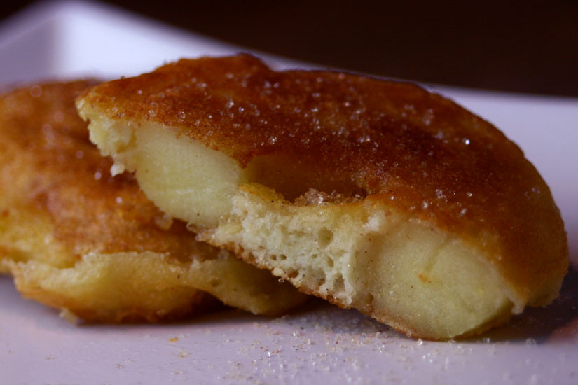 - Apfelscheiben durch den Teig ziehen und in einer Pfanne mit einer Öl-Butter-Mischung bei mittlerer Hitze auf beiden Seiten anbraten, bis die Apfelküchle goldbraun sind.