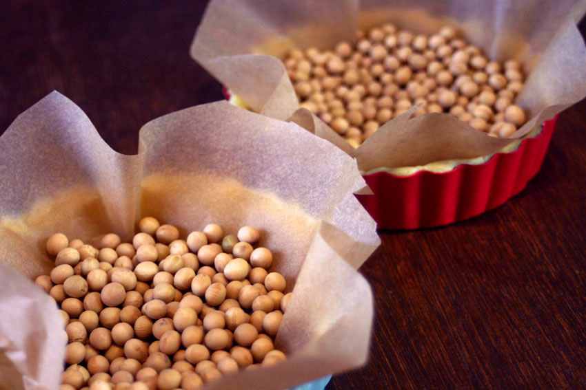• Mürbteig auswellen und in eine gefettete Tarteletteform geben. Mit einer Gabel mehrfach einstechen, mit Backpapier belegen und mit Hülsenfrüchten (z.B. Erbsen oder Sojabohnen) beschweren. bei 175 °C etwa 10 Minuten blind, dann weitere 10 Minuten ohne Belag backen, bis der Teig goldbraun wird.