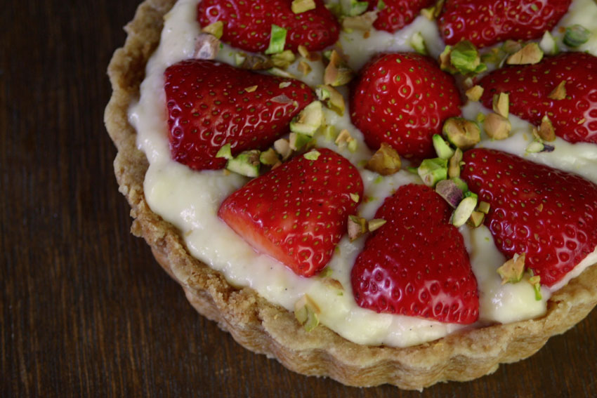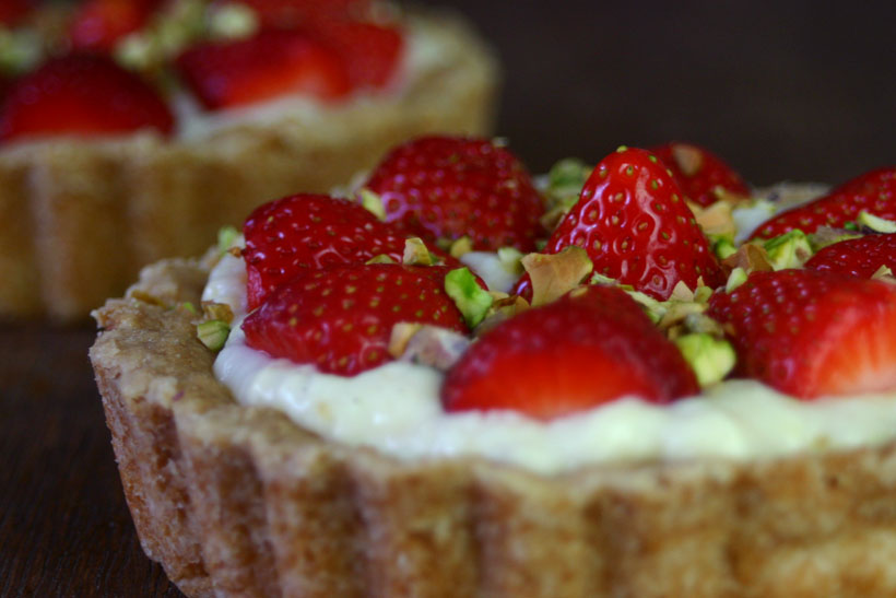 • Pistazien hacken und über das Erdbeertartelette streuen.