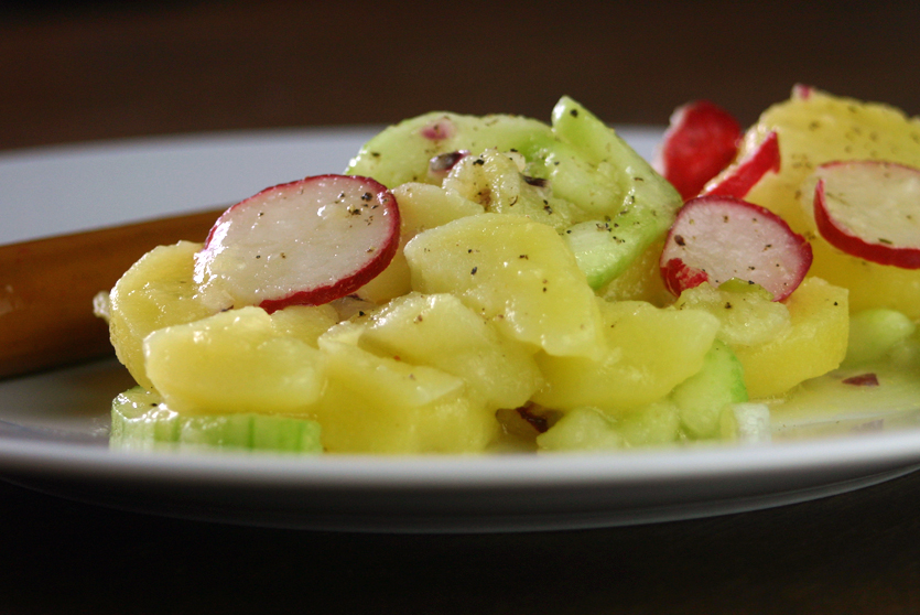 - Gurke schälen und wie Radieschen in Scheiben schneiden oder raspeln. Salzen und etwa 15 Minuten stehen lassen. Das Wasser abgießen und das Gemüse zu den Kartoffeln geben.