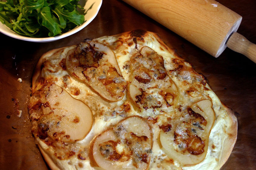 Damit im Hause Lieblingsmahl stete Essens-Harmonie herrscht, isst Herr Lieblingsmahl aufopferungsvoll und meist in Windeseile alle Birnen auf, die sich in den heimischen Obstkorb verirrt haben. Kürzlich jedoch hat er zwei Birnen übrig gelassen, um Frau Lieblingsmahl mit einem herbstlichen Klassiker zu überzeugen: Flammkuchen mit Birne und Gorgonzola. Seit diesem Tag grummelt Frau Lieblingsmahl nur noch ganz leise, wenn von der nicht mehr ganz so ungeliebten Apfelverwandten die Rede ist.