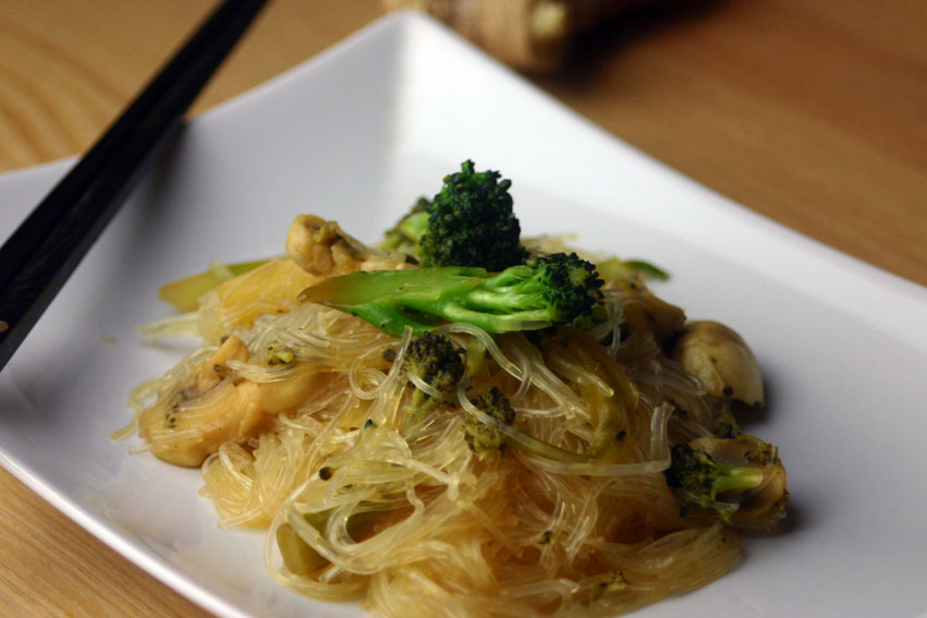 • Mit Salz und Sojasoße würzig abschmecken und ein paar Minuten köcheln lassen, bis das Gemüse bissfest ist. Währenddessen die Glasnudeln nach Packungsanweisung garen und mit dem fertigen Gemüse in einer großen Schüssel oder im Wok durchmischen.
