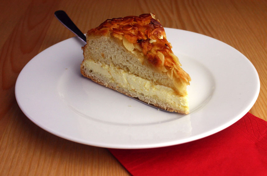 • Ausgekühlten Hefeteig halbieren und Buttercreme auf dem Kuchenboden verteilen. Den Kuchendeckel in 12 Kuchenstücke schneiden und auf der Buttercreme leicht andrücken. Anschließend kann auch der Boden geschnitten werden.