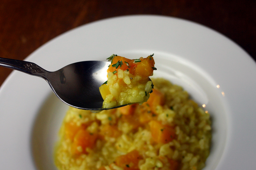 Schön machen sich geröstete Kürbiskerne oder klein geschnittene Rosmarinnadeln auf dem Teller. Nicht-Veganer können natürlich noch Parmesan hinzugeben, aber auch ohne wird das Risotto wunderbar sämig.