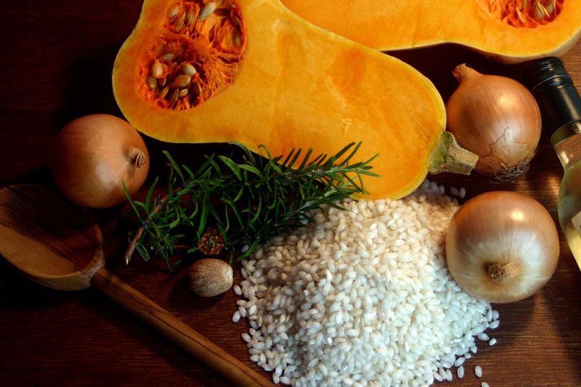 • Reis, Kürbisfleisch und Rosmarin hinzugeben, kurz erhitzen und mit Wein ablöschen