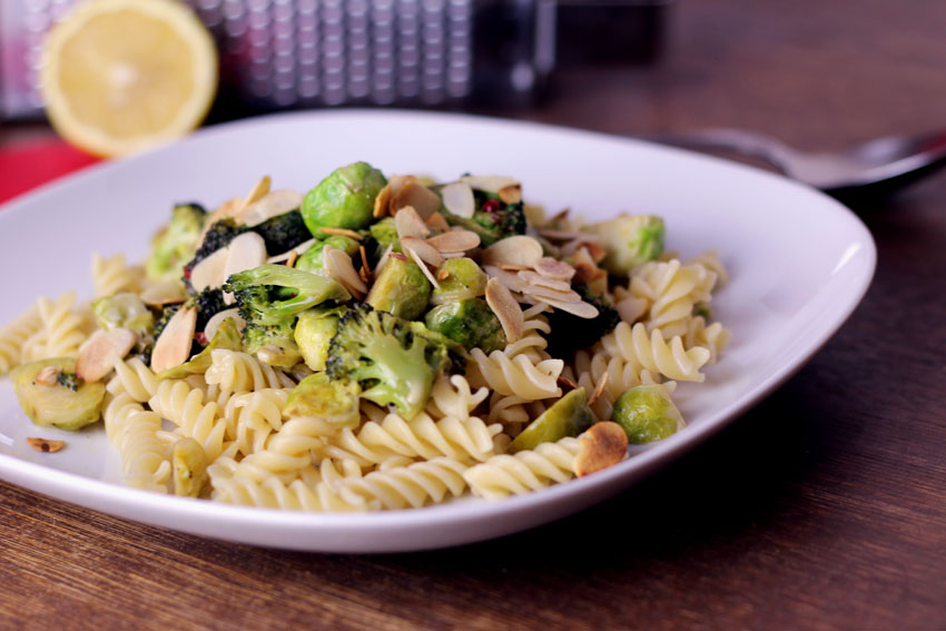 Rosenkohl und Nudeln mag zunächst als eine ungewöhnliche Mischung erscheinen, aber sie lohnt sich: Mit ein paar Brokkoliröschen und etwas Sahne kombiniert, erhält der Rosenkohl ein schönes Bett, ohne darin gänzlich zu versinken. Gehobelte angeröstete Mandeln sorgen für den Crunch bei diesem harmonischen Gericht.