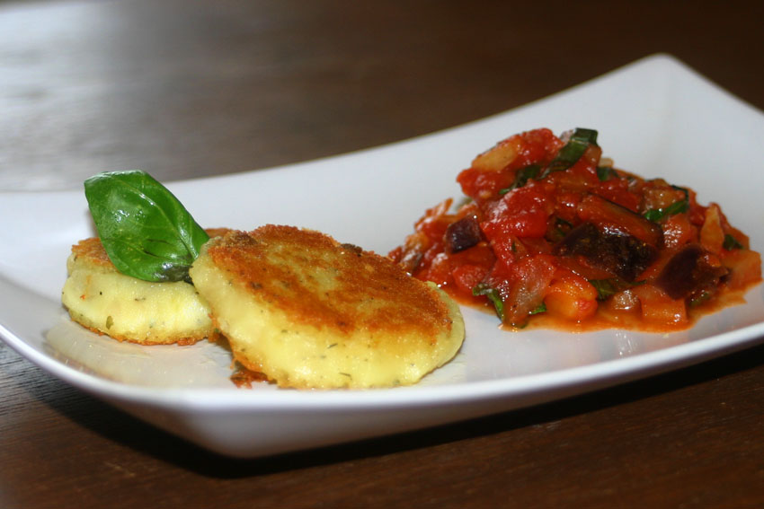 Wenn die Auberginen etwas ausgekühlt sind, halbieren und das Mark mit einem Löffel herauskratzen und kurz pürieren.